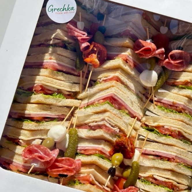 Мини сэндвич с курицей, ветчиной и лососем. В боксе 24 мини сэндвича.