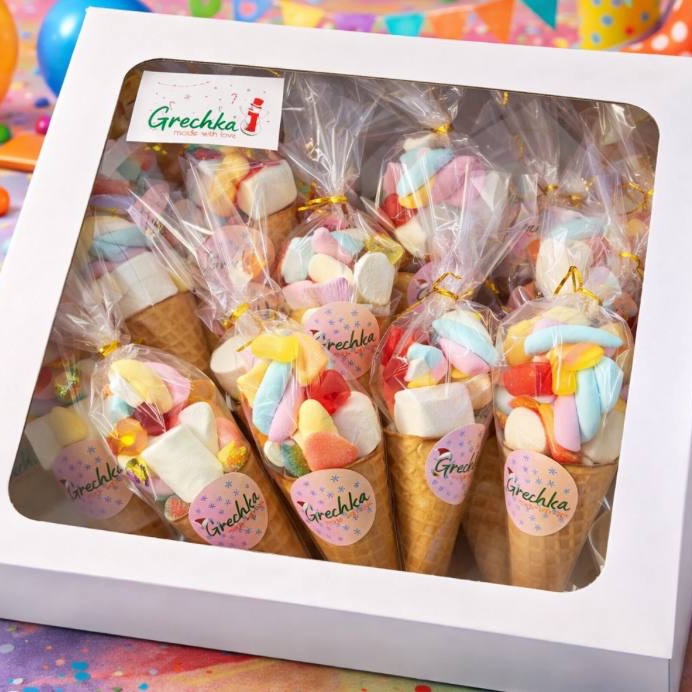 Вафельные рожки с наполнениями из мармелада, маршмеллоу, конфетами. На фото 16 рожков. (Количество можно изменить по ваше мероприятие)
