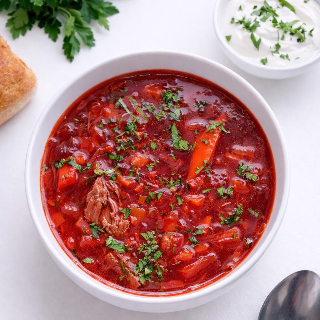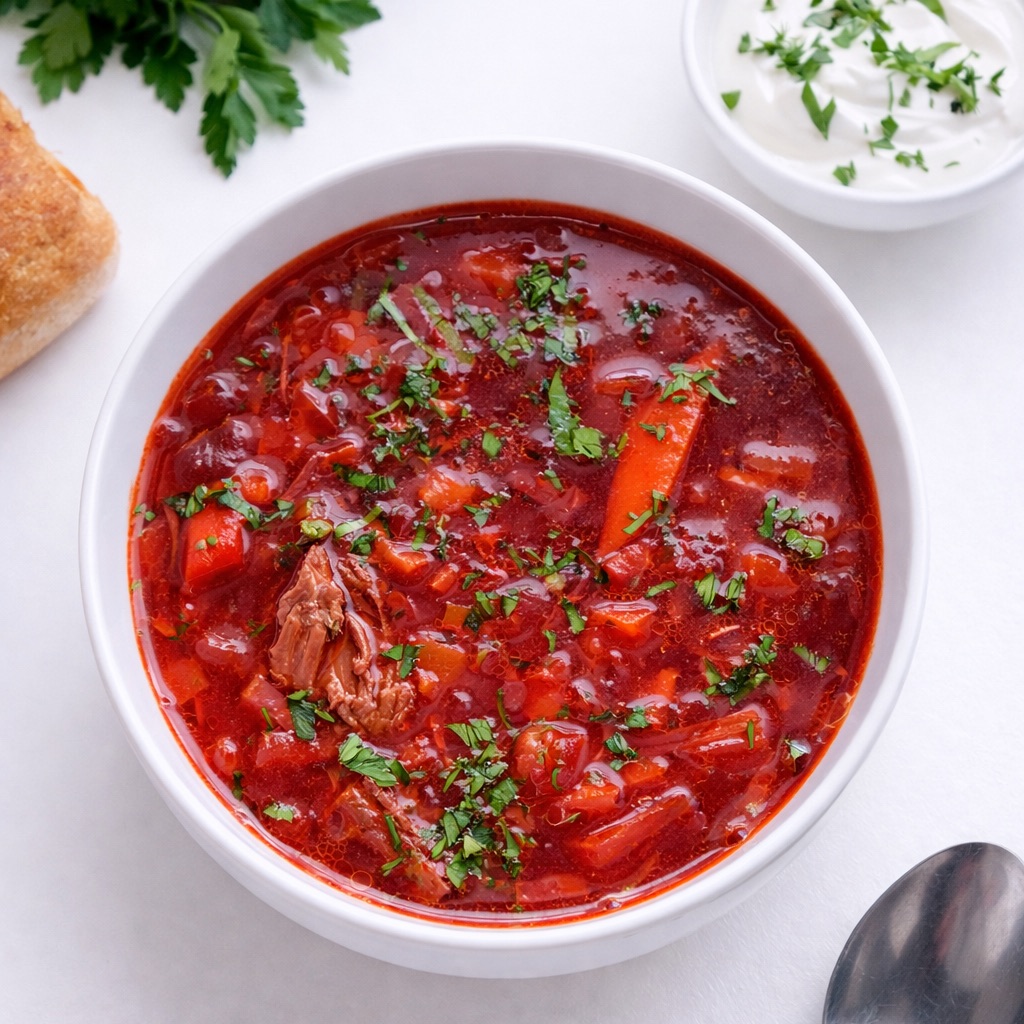 Густой овощной суп на говяжьем бульоне. Свёкла придаёт ему яркий и насыщенный оттенок, а томатная паста — приятную кислинку. Овощи добавляют текстуры и сладости, картофель делает суп сытным. Вкус получается сложным и многогранным, а аромат пробуждает аппетит.