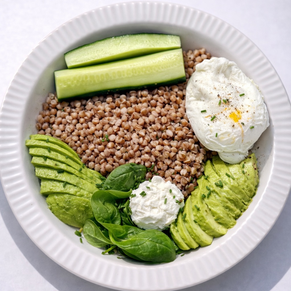 Ингредиенты: гречневая крупа, шпинат, куриное яйцо, авокадо, соль, перец.