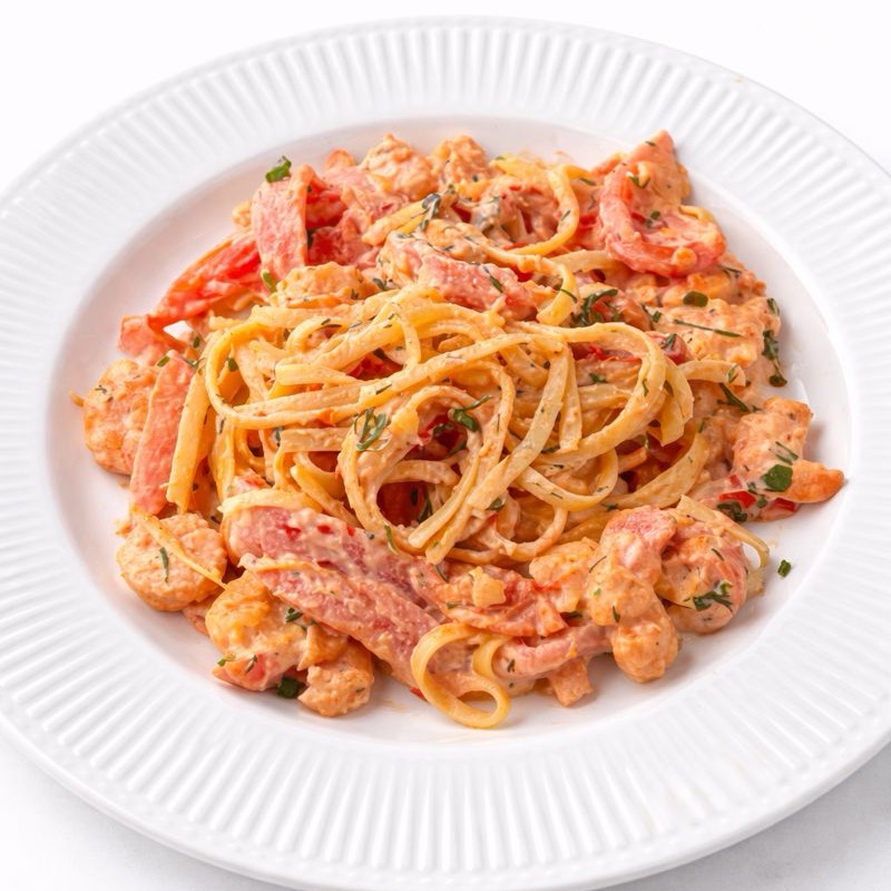 Новинка в нашем меню — паста с креветками: тальятелле в сливочном соусе с креветками, чесноком, томатами, солью и перцем.
